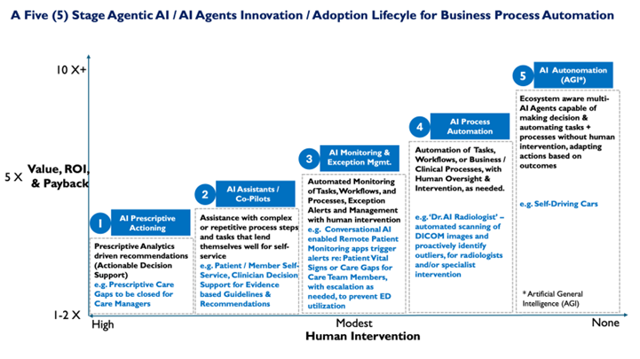 To address this need, I’ve developed a “Five-Stage Agentic AI Innovation and Adoption Lifecycle.” This framework is designed to guide organizations through the evolution of business, operational, and clinical process automation in population health management and beyond. While rooted in healthcare, this lifecycle can be extended across virtually any industry, including life sciences, consumer packaged goods, manufacturing, logistics, and retail.